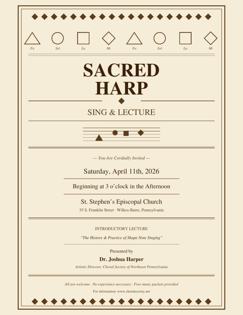 Join Dr. Joshua Harper as he shares a bit about early American singing as we celebrate America at 250! Co-Sponsored by St. Stephen’s Episcopal Pro-Cathedral, this event will begin with a lecture, followed by some singing! We’d love to see you there. Free and open to the public, and materials will be provided! Use the contact form on our website for more information!